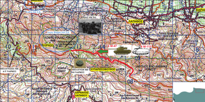 «Οι Τούρκοι εισβολείς υποστηριζόμενοι από τέσσερα άρματα μάχης, δυο τεράστια «Μ-48» και δυο μικρότερα «Μ-49»,προσπάθησαν να καταλάβουν το Λάρνακα της Λαπήθου και το Αγριδάκι. Όμως οι ηρωικοί μας εθνοφρουροί, με απαράμιλλο θάρρος και πρωτοφανή ανδρεία, κατόρθωσαν μετά από πολύωρη αντίσταση να ανακόψουν στην κρισιμότερη στιγμή τα τουρκικά τανκς και στρατεύματα και να εξαπολύσουν θυελλώδη αντεπίθεση. Οι Τούρκοι εισβολείς προ του κινδύνου, εγκατέλειψαν τα τέσσερα τανκς και άλλον οπλισμό και ετράπησαν σε άτακτων φυγή».
