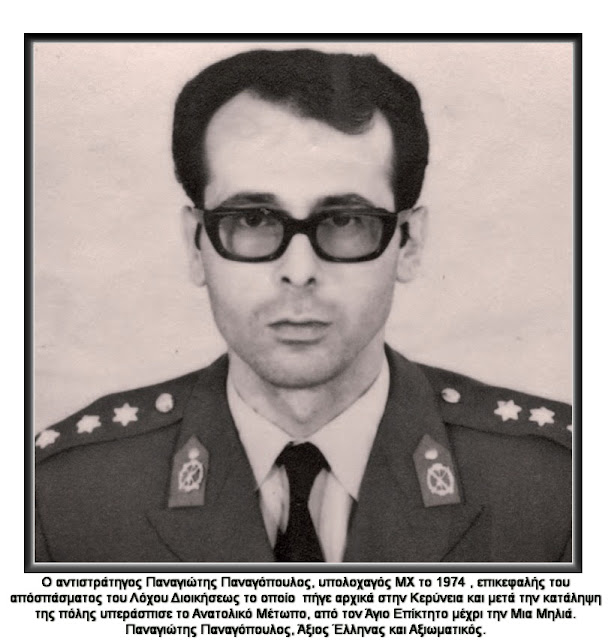 Ο αντιστράτηγος Παναγιώτης Παναγόπουλος, υπολοχαγός ΜΧ το 1974 , επικεφαλής του απόσπάσματος του Λόχου Διοικήσεως το οποίο πήγε αρχικά στην Κερύνεια και μετά την κατάληψη της πόλης υπεράσπισε το Ανατολικό Μέτωπο, από τον Άγιο Επίκτητο μέχρι την Μια Μηλιά.
