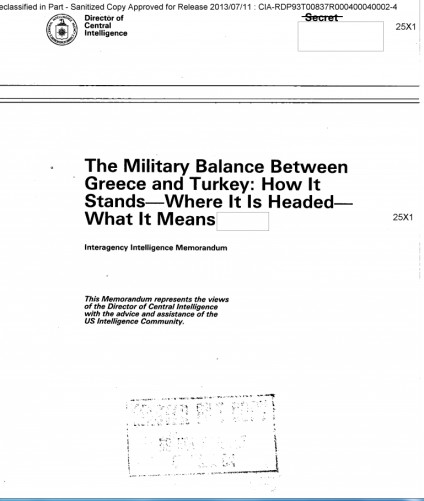 •Στο έγγραφο της CIA γίνεται αναφορά στα ελληνικά νησιά Ρόδος,Κως, Σάμος,Χίος, Λέσβος και Λήμνος. Η άμυνά τους εθεωρείτο επαρκής στην αντιμετώπιση της 4ης Τουρκικής Στρατιάς του Αιγαίου. Οι συγκρίσεις που κάνουν σε χερσαίες δυνάμεις, αεροπορία και ναυτικό μετέδιδαν πάντα την εικόνα μιας πολύ αμφίρροπης στρατιωτικής σύγκρουσης.Το συμπέρασμα που προκύπτει από το έγγραφο είναι ότι ο χρόνος θα λειτουργούσε εις βάρος της Ελλάδας. Οι Αμερικανοί έκαναν αυτή την εκτίμηση στηριζόμενοι στα οικονομικά μεγέθη των δύο χωρών, που έδειχναν ότι η Ελλάδα δεν θα μπορούσε να αντέξει την κούρσα των εξοπλισμών.Τουλάχιστον με τον τρόπο που αντιμετώπισε η χώρα τον εξοπλισμό των ΕΔ. Είναι γνωστό τι ακολούθησε.