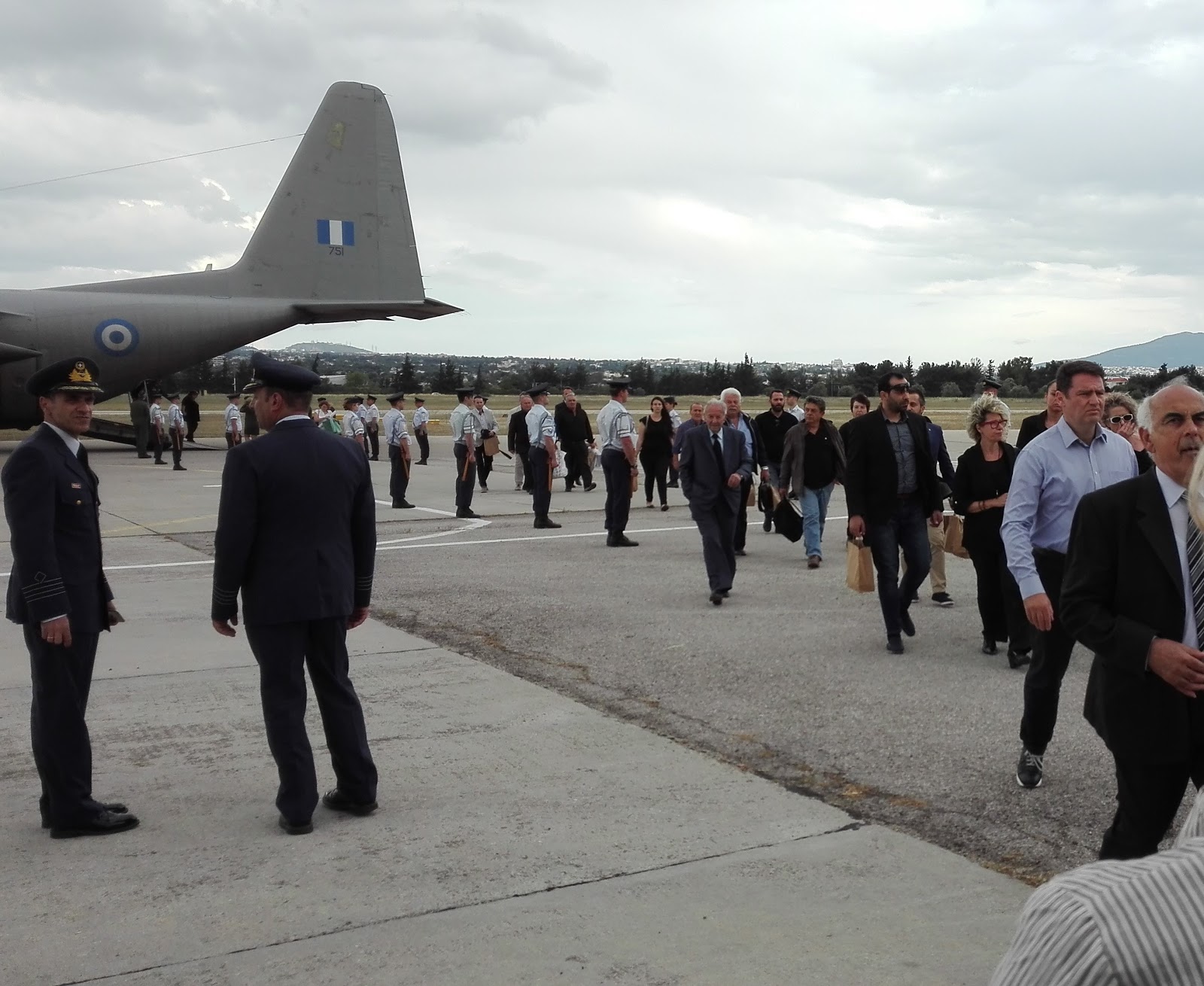 Στην 123η σμηναρχία τεχνικής εκπαίδευσης στην αεροπορική βάση Δεκελείας στο Τατόι, προσγειώθηκε λίγο πριν τις 5 το απόγευμα το C-130 της πολεμικής Αεροπορίας, που μετέφερε τα λείψανα των Ελλήνων στρατιωτικών και συνόδευαν ο αρχηγός ΓΕΣ αντιστράτηγος Αλκιβιάδης Στεφανής και συγγενείς των πεσόντων.Μέσα σε μία ιδιαίτερα φορτισμένη συγκινησιακά ατμόσφαιρα, ο αρχηγός ΓΕΣ απευθύνθηκε προς τον υπουργό Εθνικής 'Άμυνας Πάνο Καμμένο ως εκπρόσωπο της πολιτικής και στρατιωτικής ηγεσίας που παρέστη στην τελετή παραλαβής των λειψάνων, αναφέροντας χαρακτηριστικά: