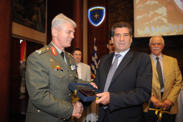 Ο Πρόεδρος του Συνδέσμου Καταδρομέων και Ιερολοχιτών Μακεδονίας επιδίδει την πλακέτα με το έμβλημα του Συνδέσμου στον Δκτή Γ΄ ΣΣ Αντγο Μπίκο Δημήτριο