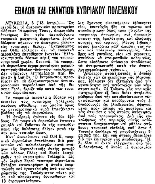 Το 2007 είχε εξιστορήσει για πρώτη φορά στην «Καθημερινή» το χρονικό της μάχης, με αφορμή το πρώτο μνημόσυνο που τελέστηκε τότε εις μνήμην των πεσόντων στη Λευκωσία. Δέκα χρόνια μετά, μας δείχνει ασπρόμαυρες φωτογραφίες-ντοκουμέντα από τον βομβαρδισμό και διηγείται με ευθύ βλέμμα και μια χαρακτηριστική βραχνάδα στη φωνή τα γεγονότα.