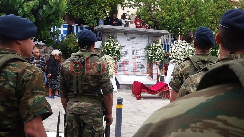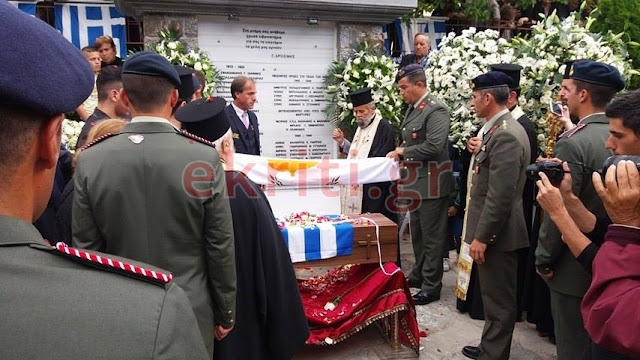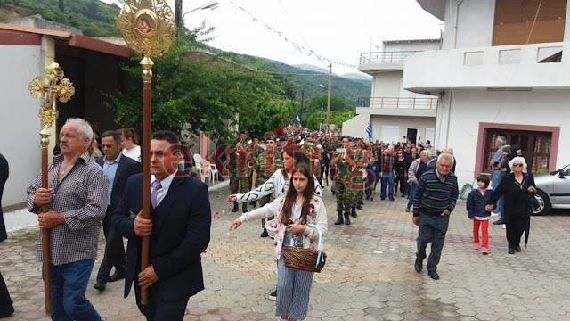 Σε όλη τη διαδρομή, οι γυναίκες του χωριού έραναν με ροδοπέταλα την πομπή. Στρατιωτική μπάντα και άγημα της ΣΕΑΠ συνόδευσε την τελετή ενώ στις 15:00 θα γίνει η ταφή στο Μνημείο πεσόντων του χωριού, δίπλα στον ναό.