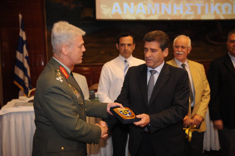 Ο Πρόεδρος του Συνδέσμου Καταδρομέων και Ιερολοχιτών Μακεδονίας επιδίδει την πλακέτα με το έμβλημα του Συνδέσμου στον Δκτή Γ΄ ΣΣ Αντγο Μπίκο Δημήτριο